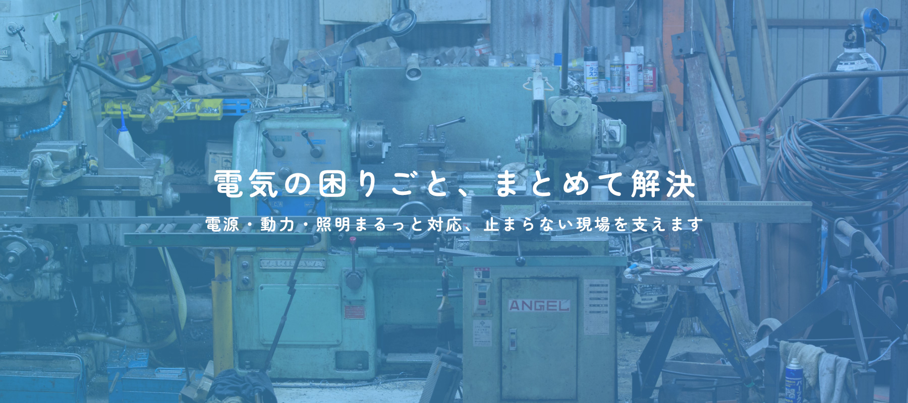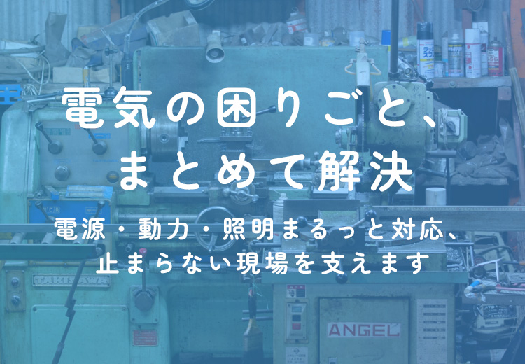 倉敷市を拠点に、岡山県全域の工場・倉庫・店舗の設備電源工事、動力工事、照明工事やLED更新まで対応しています。 現場の都合に寄り添い、確かな施工をお届けします。